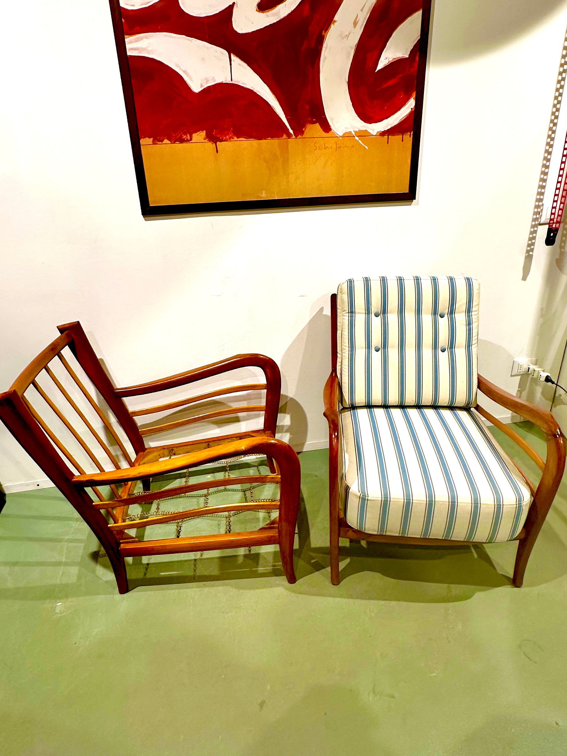 Coppia di poltrone "PAOLO BUFFA" att. anni 40. Restaurate nelle parti lignee e nelle imbottiture. Versione che presenta le parti strutturali in legno di ciliegio e nelle finiture in legno di acero. Finitura a gommalacca e alcool. Tessuto delle sedute in rigato avorio ottanio con caratteristiche antimacchia indeformabile. Condizioni ottime.