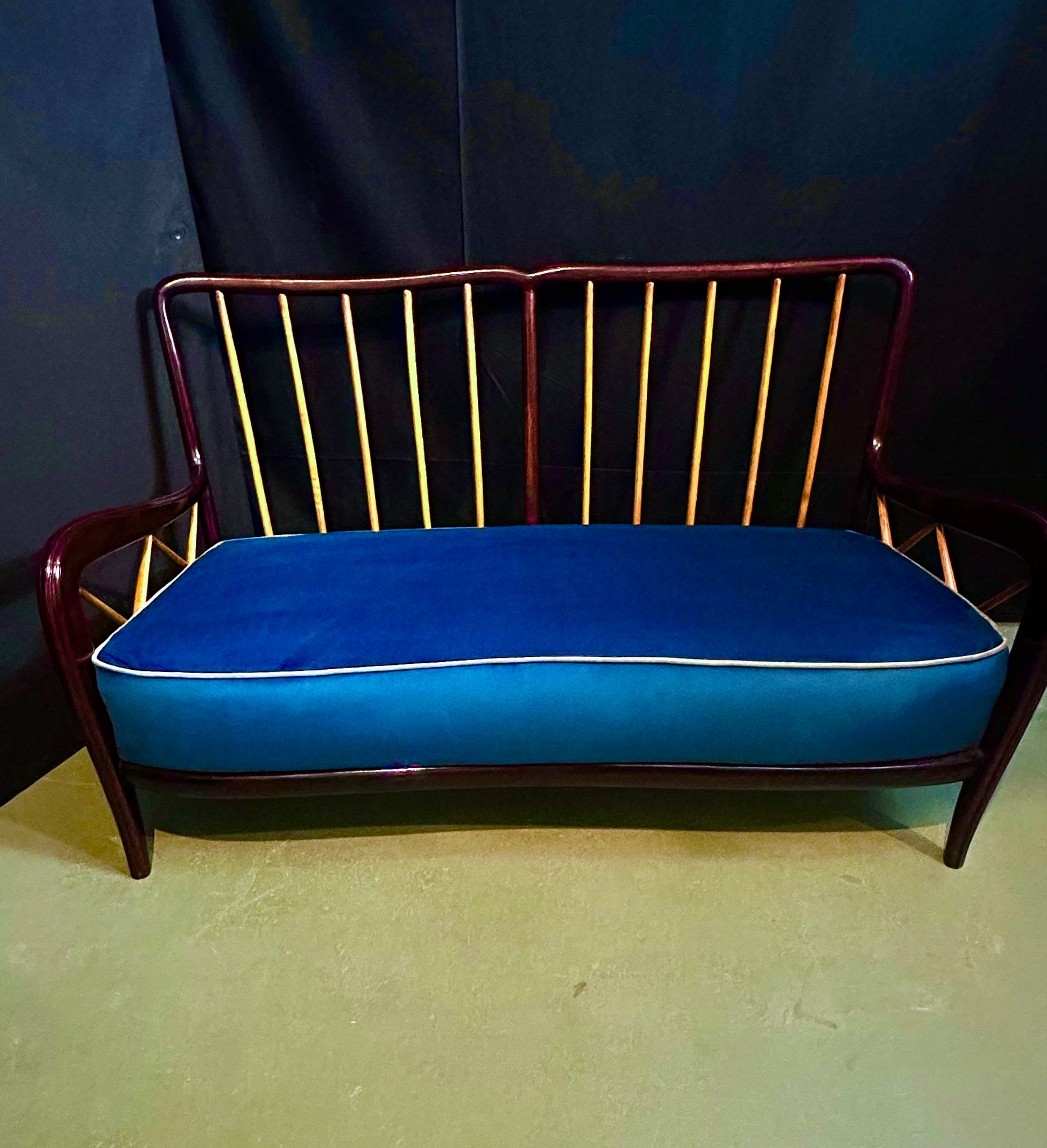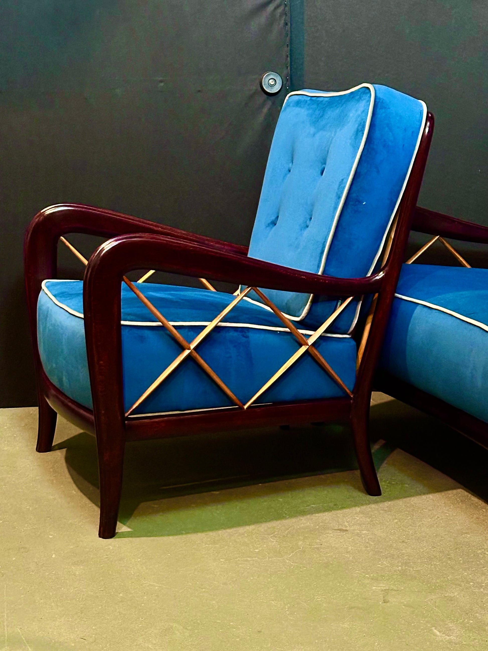 Straordinario set composto da due poltrone e un divano anni '40 "PAOLO BUFFA" ( 1903-1970 ). Stato di conservazione ottimo. Leggera lucidatura a gommalacca ed alcool. Sedute e cuscini rivestiti con velluto blu petrolio e profili grigio perla. Nella struttura di legno sono presenti alcune timbriche originali dell'ebanisteria costruttrice purtroppo non identificabili ma che avvalorano la provenienza di qualità.